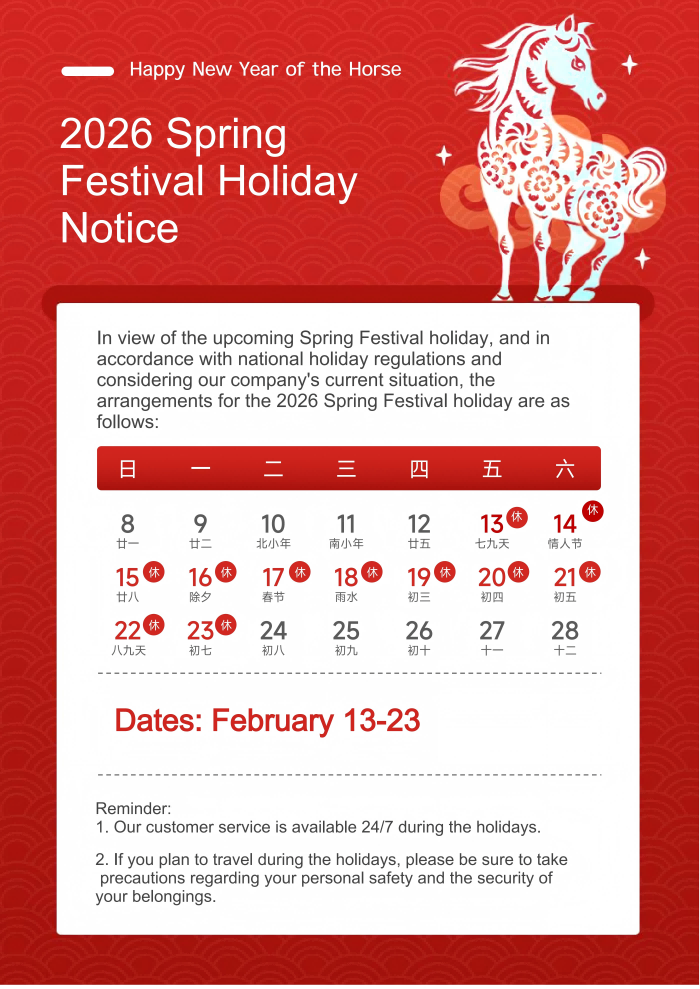 2026 Spring Festival Holiday Schedule: February 13th – February 23rd